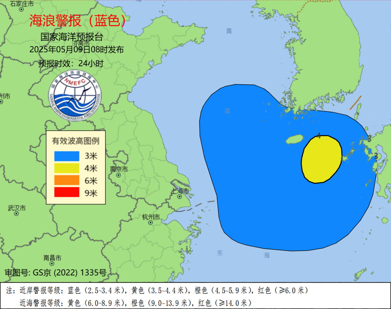 受出海气旋的影响,瞻望5月9日白日,黄海南部、东海北部将出现2.5到4米的大浪到巨浪区;江苏南部、上海、浙江北部近岸海域将出现1.5到2.5米的中浪到大浪,近岸海域波涛预警级别为蓝色。