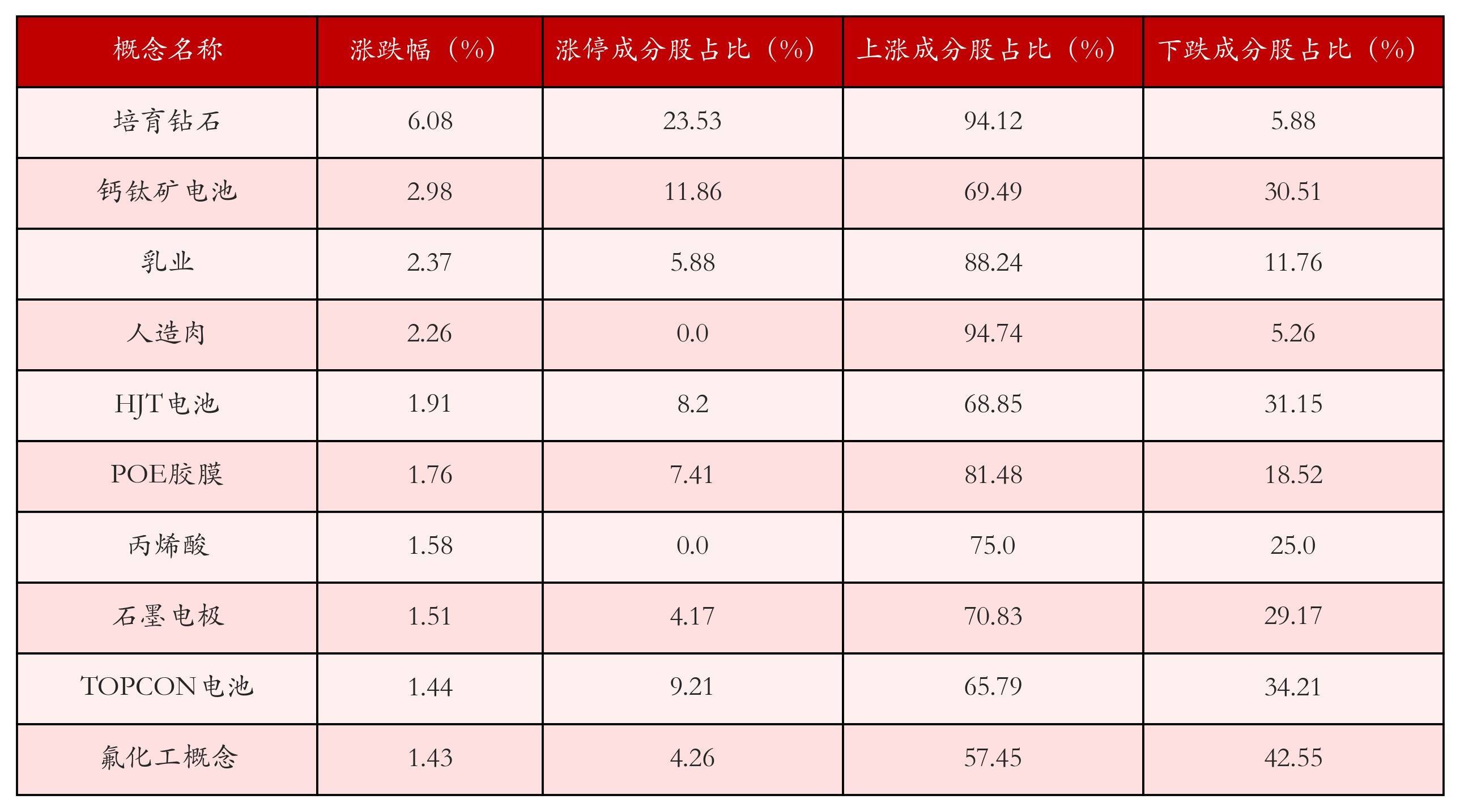 阐述A股见识涨跌幅与所对应的股票池抽象分析,涨幅靠前的三个见识板块永诀为:莳植钻石、钙钛矿电板与乳业。名次前10位的见识板块相干数据见下表: