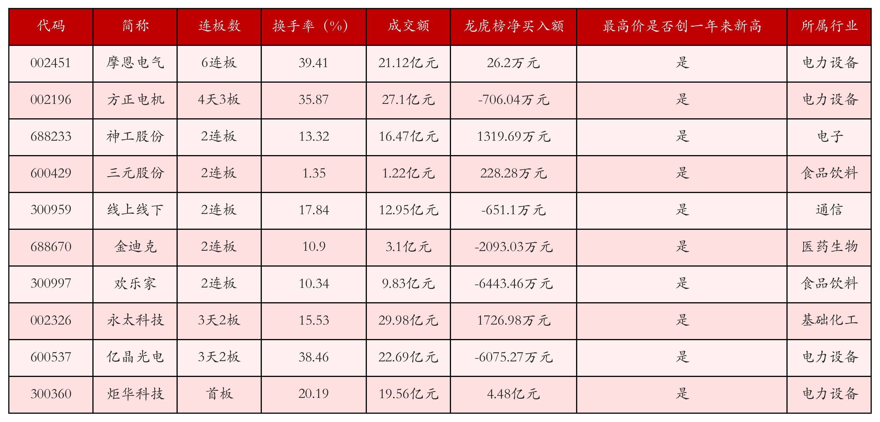 齐备11月11日收盘,上证综指着落0.39%,收于4002.76点,深证成指着落1.03%,收于13289.0点,创业板指着落1.4%,收于3134.32点。当天沪深两市A股认为81只涨停,抽象刻下连板数以及当日龙虎榜数据,其中较为强势的前三只个股永诀为:摩恩电气(002451)、方正电机(002196)与神工股份(688233)。当天强势个股前10位具体数据见下表: