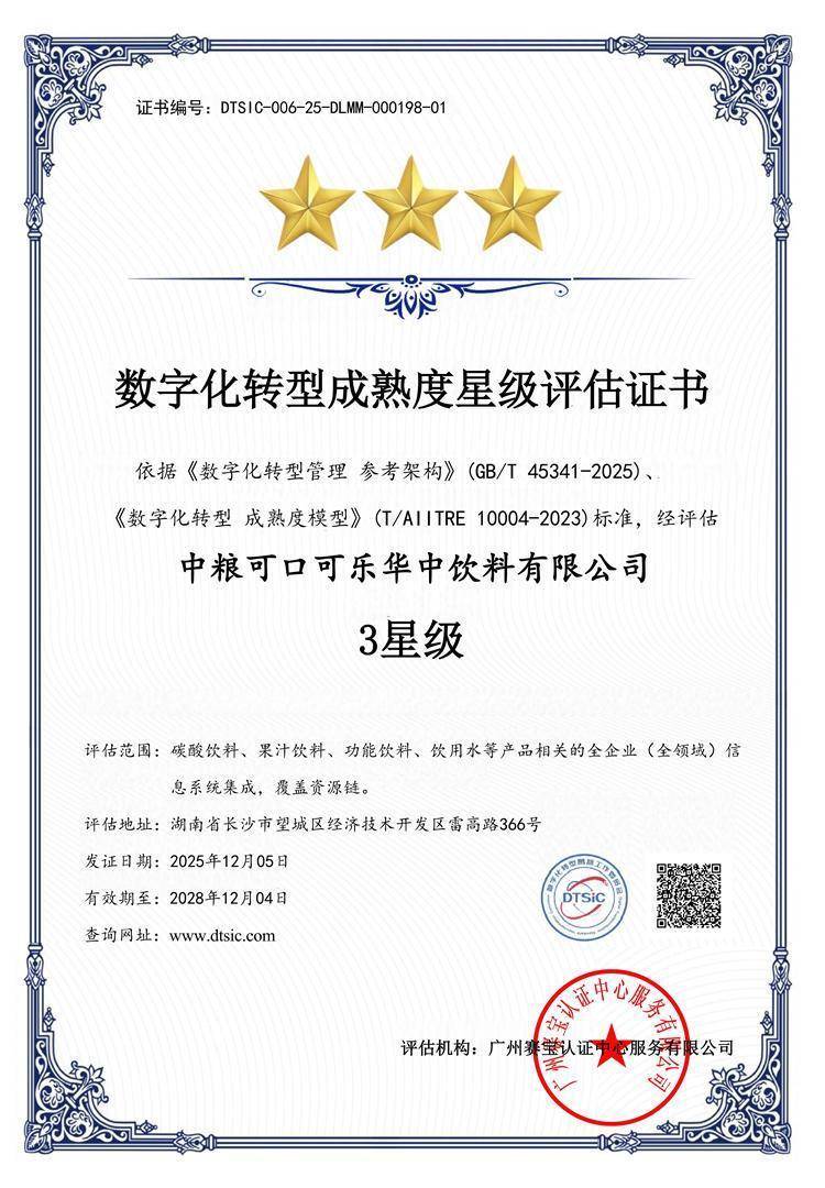 这次评估依据GB/T 45341—2025《数字化转型管束参考架构》及T/AIITRE 10004—2023《数字化转型熟练度模子》两项圭臬,由中国电子信息行业鸠合会数字化转型贯标责任委员会组织履行。评估从发展政策、新式才能、处置体系及业务翻新转型等多个维度,对公司的数字化发展才能进行了全主义的概括评定。获取“三星级”认证,是对中粮适口可乐华中公司耐久以来系统性鼓吹数字化转型政策的围聚详情。一直以来,中粮适口可乐华中公司恒久将数字化视为开动高质地发展的中枢引擎。这次获评“三星级”,不仅是一项泰斗荣誉,更是对企业既往转型试验的科学追溯与才能背书。瞻望将来,中粮适口可乐华中公司将以这次星级评估为新着手,抓续深切数字化转型政策。在已有用果基础上,进一步推动数字时刻与实体经济深度会通,探索更多翻新哄骗,抓续提高数字化转型水平,死力于于打造更具韧性、更有用率、更可抓续的贤达型企业,为饮料行业的数字化升级和高质地发展孝顺积蓄更强内力。举报/反映