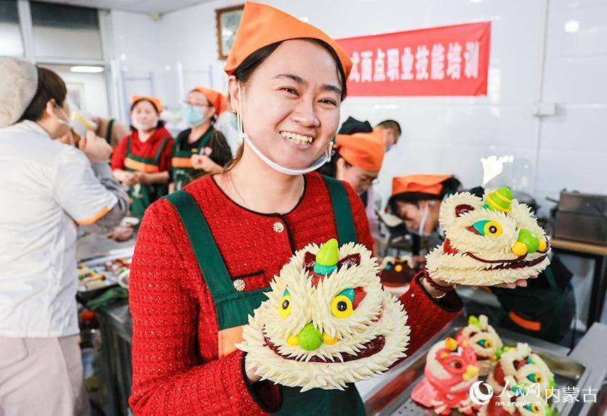 学员在呼和浩特市玉泉区一家培训学校展示制作好的醒狮花馍。丁根厚摄